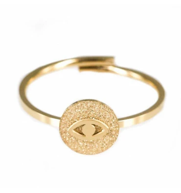 Bague ajustable signée ZAG Bijoux sur laquelle est sertie une plaque martelée au motif d’œil protecteur en relief.