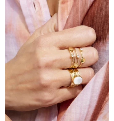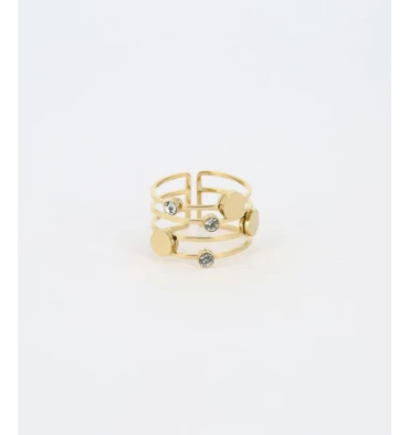Bague large ajustable en acier doré à l’or fin formée de plusieurs anneaux parsemés de zirconiums serties et de plaques rondes.
