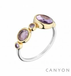 Bague signée CANYON France constituée de 5 Améthystes violettes serties de laiton sur un anneau fin.