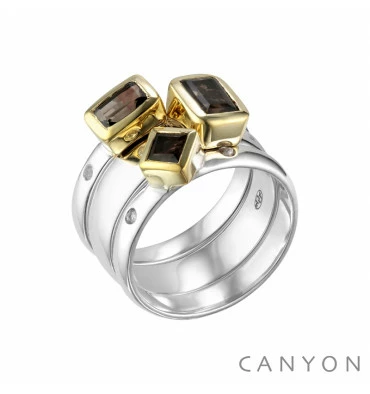 Bague signée CANYON France composée de 3 anneaux imbriques pour former une seule bague chacun étant décore de quartz fumé carré ou rectangle de tailles différentes et avec un collet en laiton et 2 micro oxydes sur l’anneau de chaque cote des pierres.
