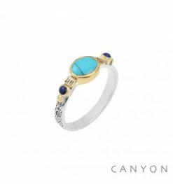 Bague signée CANYON constituée d’un anneau gravé et décoré d’une turquoise reconstituée et de 2 perles synthétiques lapis serties de laiton.