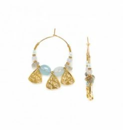Composition de la ligne: Aigue Marine, Calcédoine Bleue, Laiton, Métal doré à l’or fin sans nickel et traité contre les allergies.