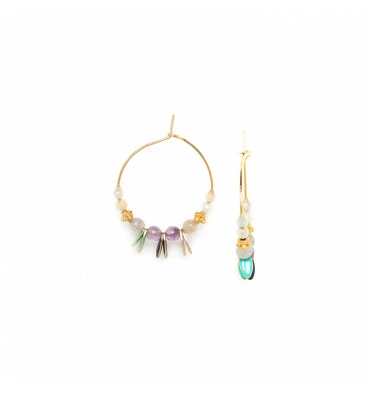 Composition de la ligne : Agate, Amazonite, Améthyste, Labradorite, Lapis-Lazuli, Swaroski, Métal doré à l’or fin sans nickel et traité contre les allergies.