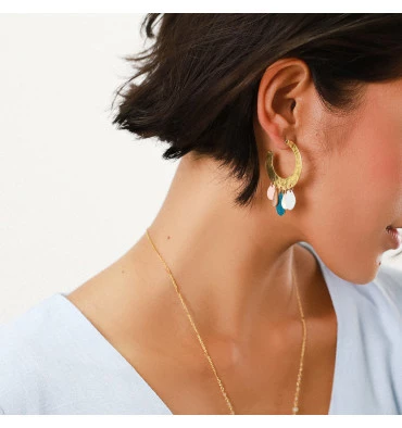 Composition de la ligne : Étain, Laiton, Nacre Brune, Métal doré à l’or fin sans nickel et traité contre les allergies.