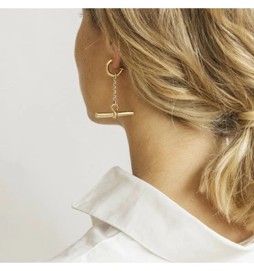 Boucles d’oreilles créoles signées CXC ornées d’une barrette de 3.3 cm sur chaine. Les créoles sont indépendantes, elles peuvent se porter seules.