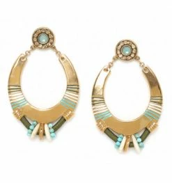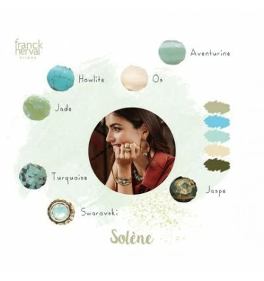 Composition de la ligne Solène : Turquoise, Jaspe, Cristal de Swarovski, Howlite, Os, Aventurine, Métal doré à l’or fin sans nickel et traité contre les allergies.