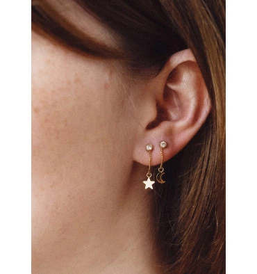 Boucles d’oreilles signées ZAG Bijoux sur lesquelles des petites breloques sont attachées à une chaînette.