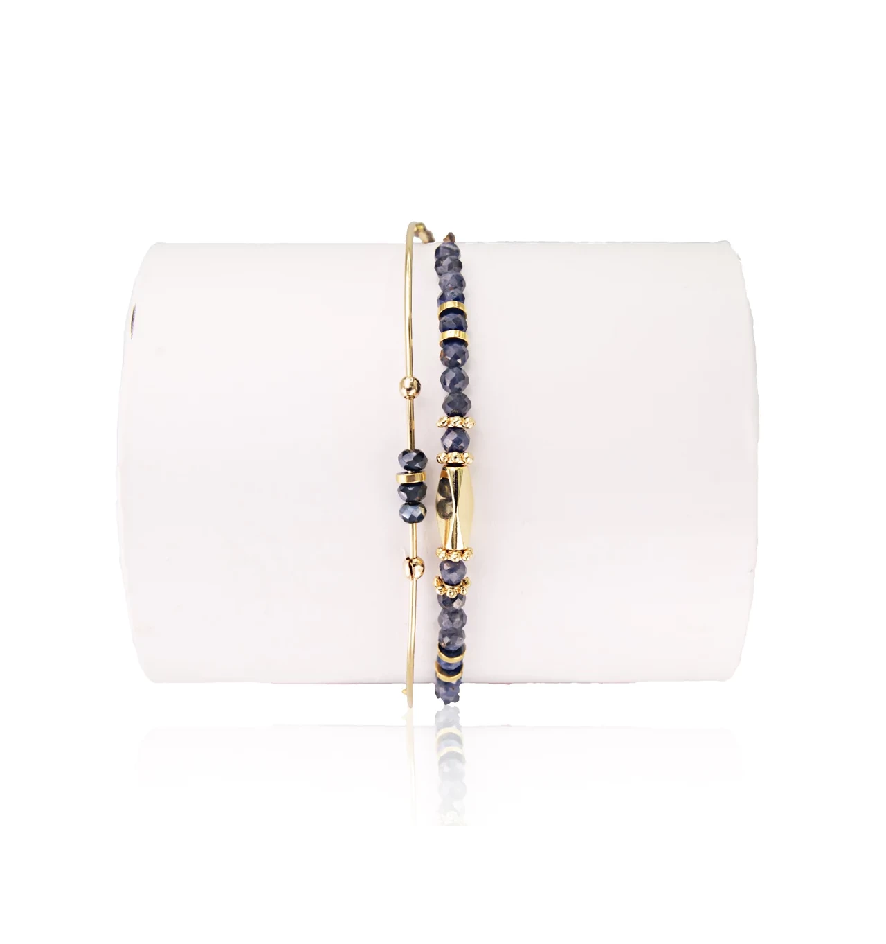 Bracelet demi-jonc signé Loetma orné de pierres semi précieuses en Saphir Bleu accompagnées de perles dorées à l’or fin 18 carats.