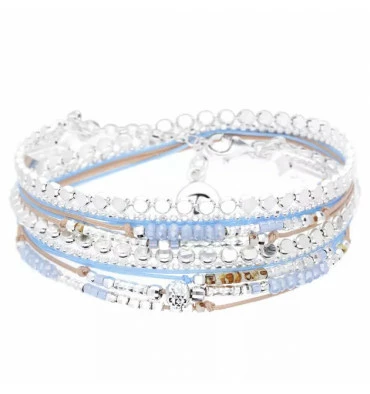 Bracelet 2 tours Mooréa signé DORIANE bijoux. Ce Bracelet Moorea Double Tours Bleu Beige Léopard se compose de Perles en Argent 925, de Cordons Bleu Saphir et Beiges, de Chaînes Fines Diamantées, d’une Perle Centrale Diamantée en Argent, de Perles de Verre de 1 mm et de Miyuki Léopard Clair de 2 mm. Ce Bracelet se compose également de jolies Mailles Plates Rock ! Ces chaînes ont été ajoutées aux Bracelets Multi-Tours pour un look Rock et innovant.