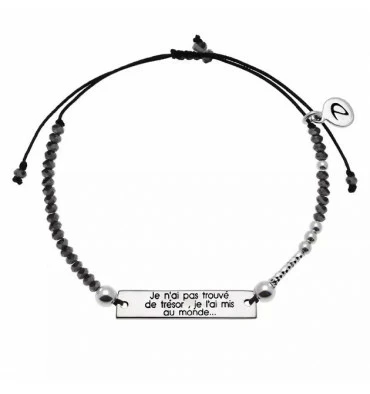 Bracelet message ajustable signé DORIANE bijoux. Ce Bracelet Perles Black se compose de Perles en Argent 925, de Perles Noires, d’un cordon Réglable grâce aux nœuds coulissants et d’une plaque Message.