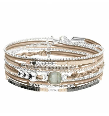 Bracelet Cassis Multi tours signé DORIANE bijoux. Entre Influence Safari et Nature, le Beige continue sa conquête de la Mode et de nos poignets ! Cette année, on l’associe à des pointes de Chocolat pour vous Réchauffer le Cœur. Ce Bracelet Cassis Beige Marron s’entremêle à vos bracelets multi tours pour ajouter une touche Tendance et Délicate à votre look. La Labradorite, qui est au centre du bijou, absorbera les ondes négatives pour votre plus grand Bonheur…
