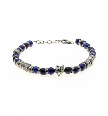 Bracelet pour homme signé DOGME96 composé de Pierres en Lapis lazuli de 6 mm et de rondelles irrégulières en argent 925 vieilli. Le bracelet est orné d’une tête de jaguar en argent.