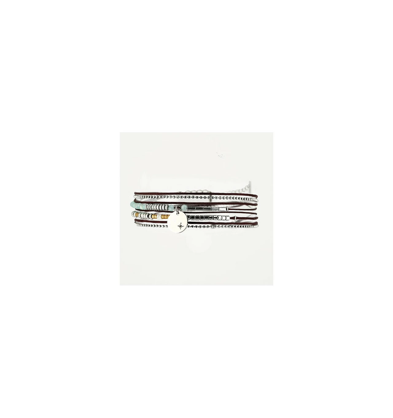 Bracelet multi cordons signé ZAG Bijoux sur lequel sont enfilées des perles de métal et de pierres fines. Une médaille ronde est également attachée aux cordons donnant à ce bracelet une allure très rock.