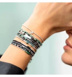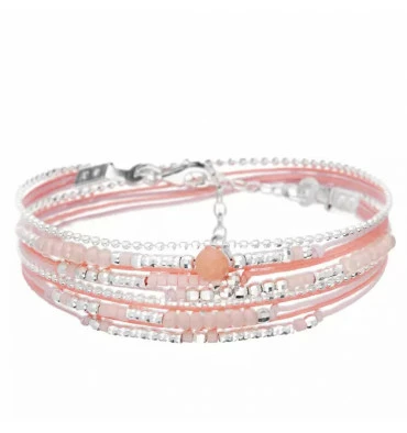 Bracelet multi tours Atlanta gris signé DORIANE bijoux. Le Bracelet Atlanta Rose se compose de cordons colorés roses, d’une chaîne diamantée, de Perles de Verre Roses de 2 mm, de Perles en Argent 925 facettées et d’une Jolie Perle de Verre Centrale Rose de 4 mm. Simple et Coloré, il a tout pour plaire !