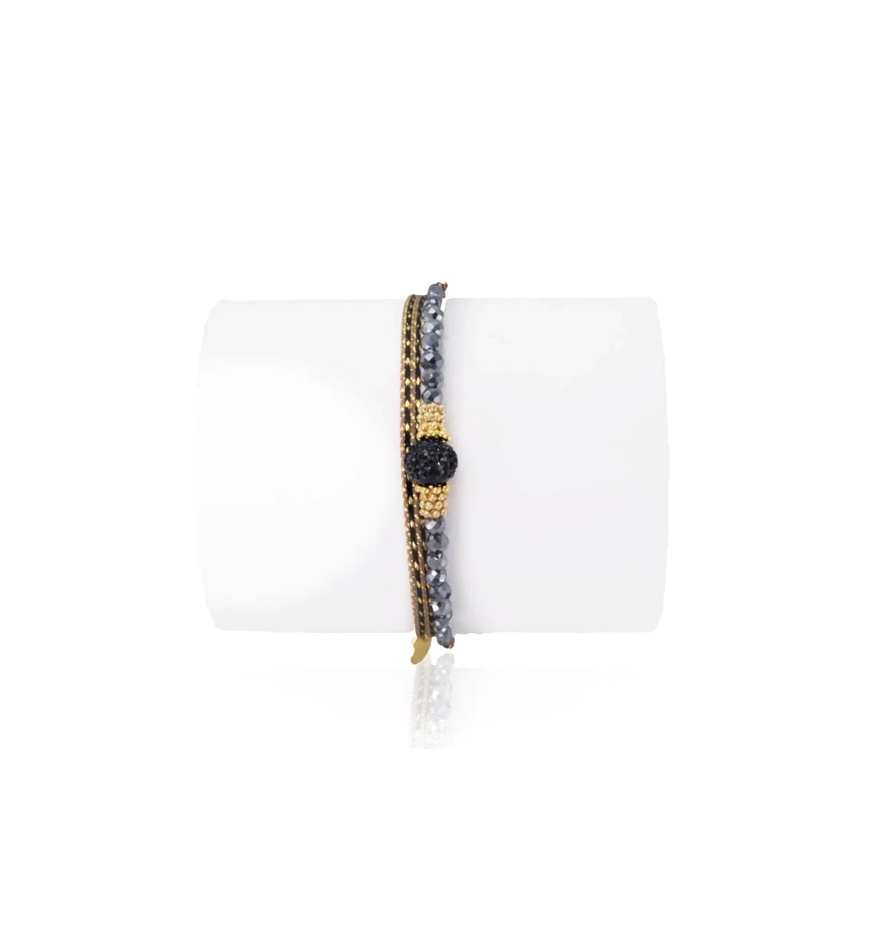 Bracelet multi tours réglables signé Loetma orné d’une perle centrale en Soleil noir et accompagnée de pierres très brillantes grises anthracites en Terghertz.