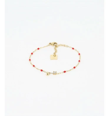 Bracelet en acier doré signé ZAG Bijoux sur lequel sont attachées sur chaque tranchée de chaîne des petites boules en émail, accompagnées d’une pampille, et en son centre d’un zirconium en sertis clos.