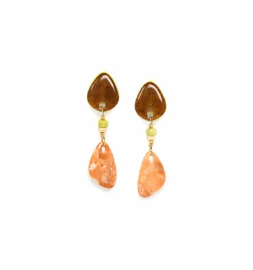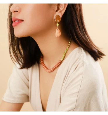 Craquez pour cette ligne de bijoux qui associent plusieurs matières naturelles telles que la noix de coco, le jaspe, le péridot, la jade, la perle de culture, la nacre brune, la feuille pour un rendu doux et poétique.