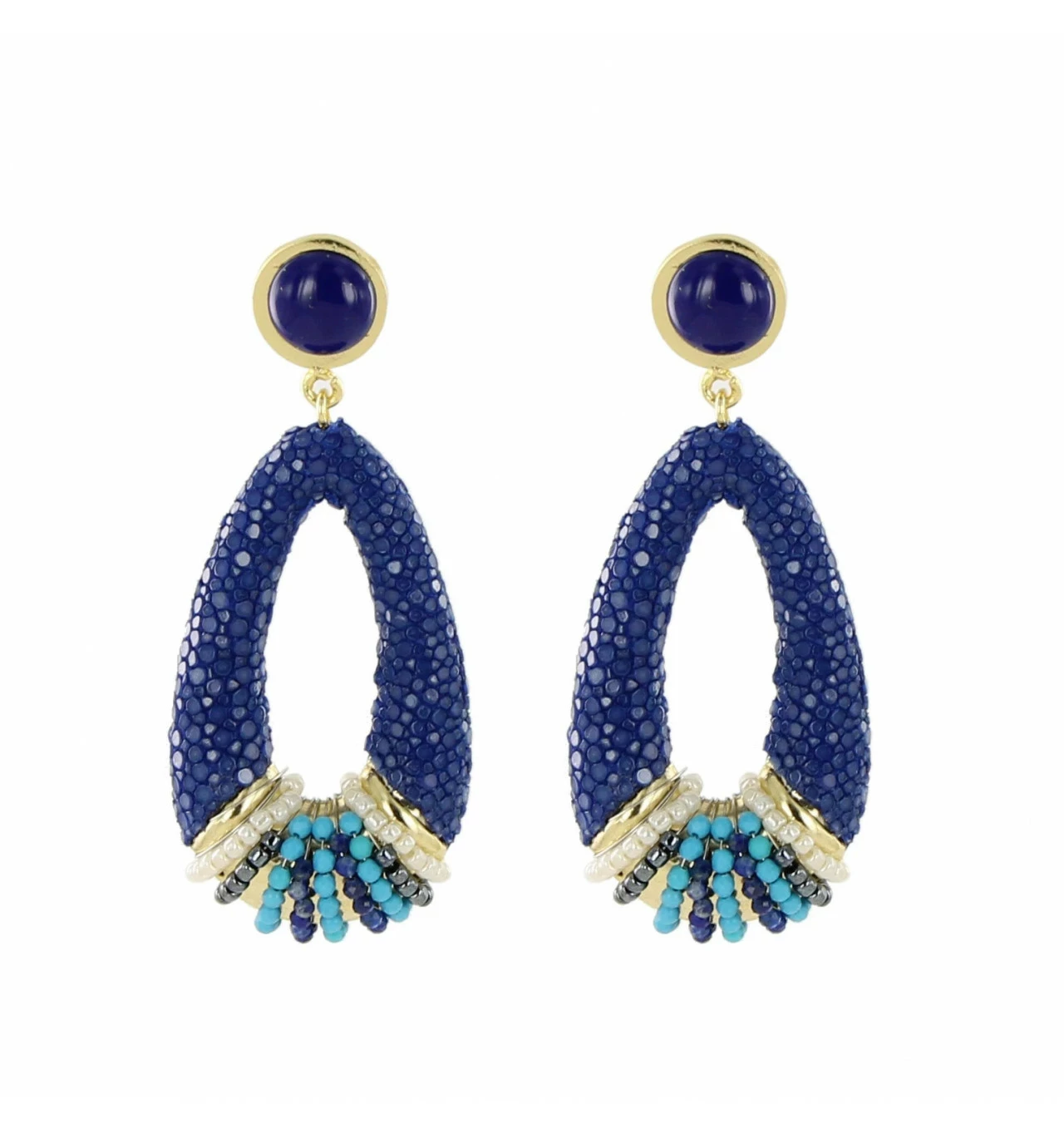 Boucles d’oreilles signées BARONG BARONG composées de cuir exotique, de perles de verre et de pierres semi précieuses.