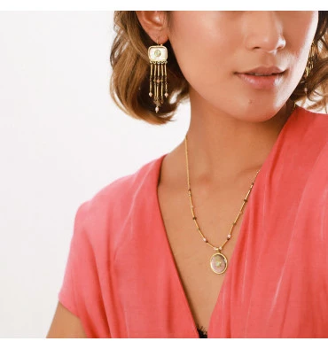 Composition de la ligne : Hématite, Jade, Nacre Brune, Perles De Culture, Swarovski, Métal doré à l’or fin sans nickel et traité contre les allergies.