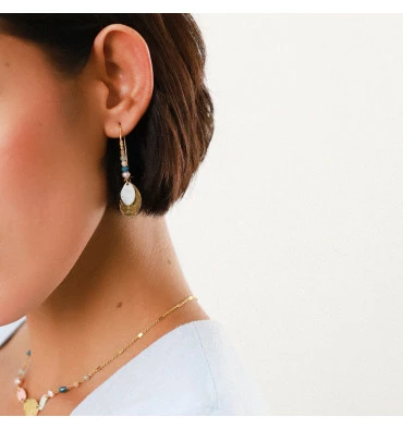 Composition de la ligne : Laiton, Nacre Brune, Swarovski, Métal doré à l’or fin sans nickel et traité contre les allergies.