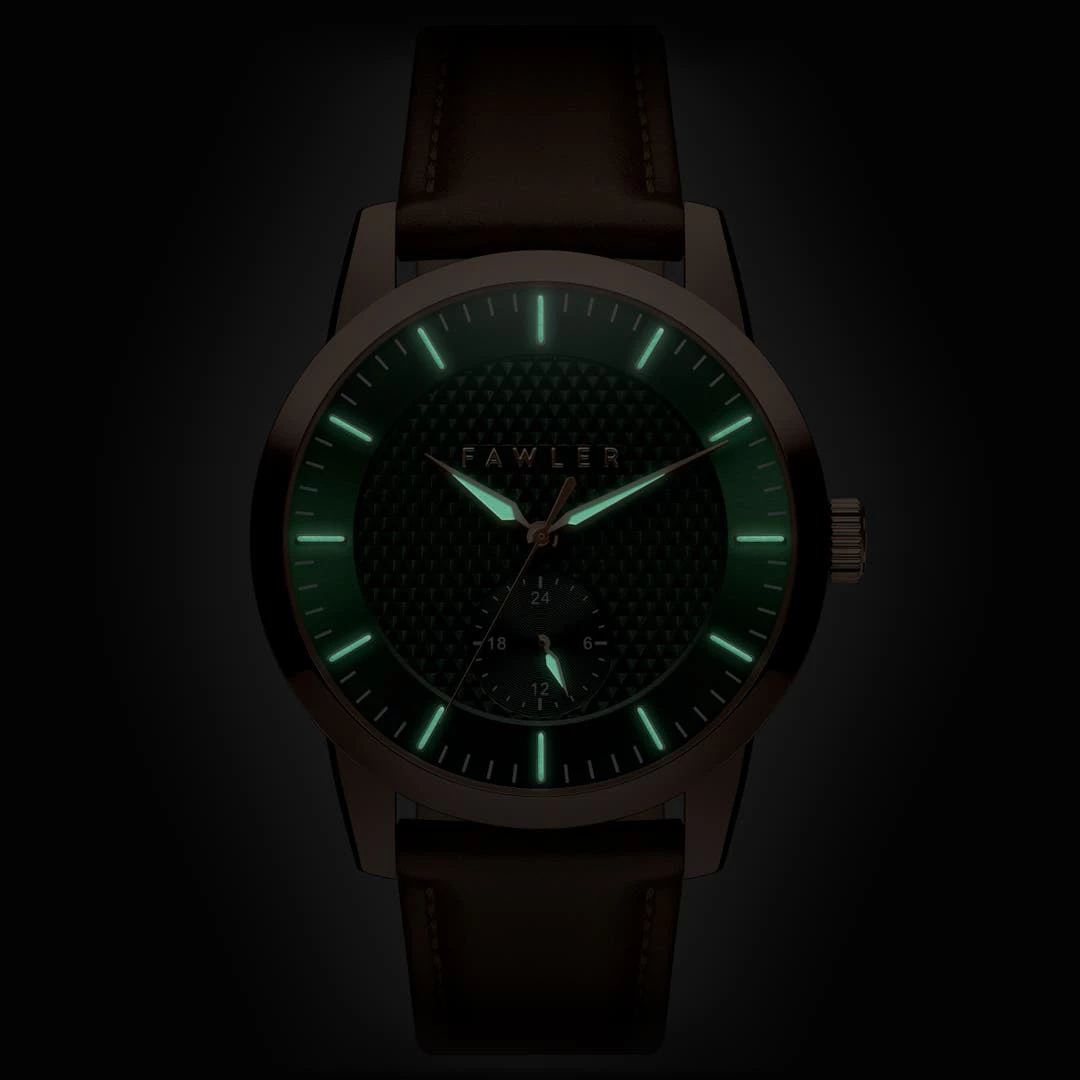 Un sous-cadran à 6 heures affiche une horloge synchronisée sur une échelle de 24 heures. Le boîtier en acier chirurgical abrite un mouvement continu Seiko (mouvement sweep second) d’une grande fiabilité. Sa couleur or rose provient de son revêtement PVD – du nitrure de titane a été fusionné à la surface du métal au niveau moléculaire pour la rendre résistante à la fois aux rayures et au ternissement et pour qu’elle ne se décolore ni ne s’écaille pas.