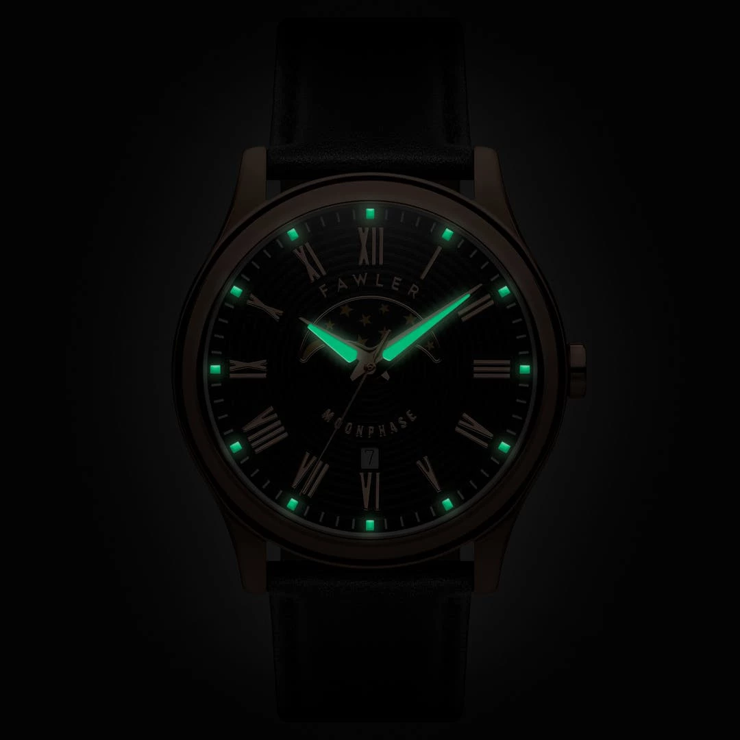 Observez le cycle lunaire grâce à l’ouverture sur cadran représentant une lune dorée flottant dans une mer d’étoiles. Des aiguilles dauphines suivent le dessin concentrique du cadran, tout comme le ferait la lune en orbite autour de la terre. Ces aiguilles sont par ailleurs luminescentes pour que vous puissiez lire l’heure dans le noir. Une discrète fenêtre calendrier est située à 6 heures sur son cadran.