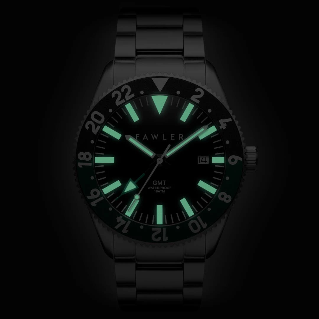 Les aiguilles argentées indiquent l’heure locale. La lunette bicolore affiche l’heure sur une échelle de 24 heures. Tournez la lunette dans le sens inverse des aiguilles d’une montre pour l’aligner avec l’aiguille GMT d’un fuseau horaire différent. Une discrète fenêtre à fonction calendrier est située à 3 heures.