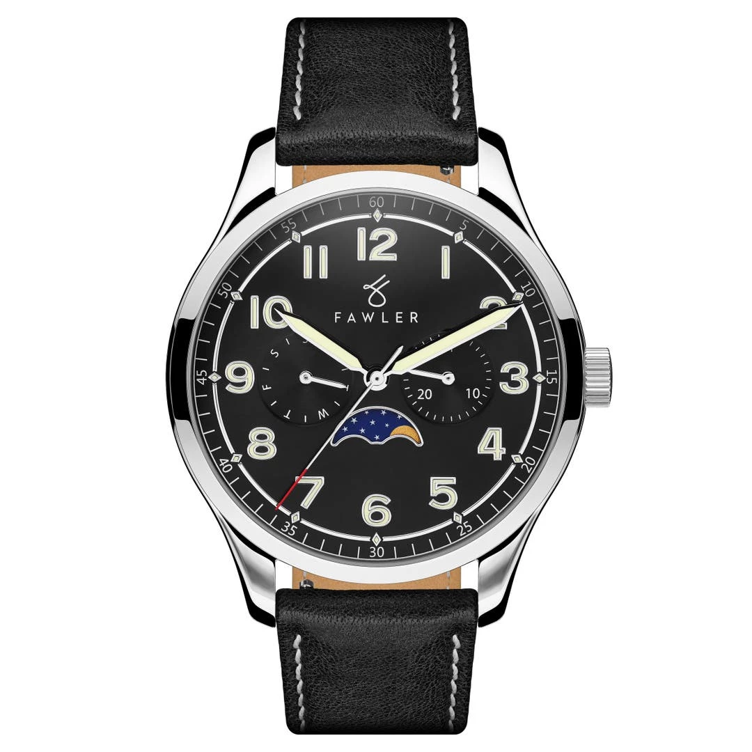Affichage du jour de la semaine, de la date, de la phase de la lune et de l’heure, le tout au sein d’un cadran sobre et épuré.