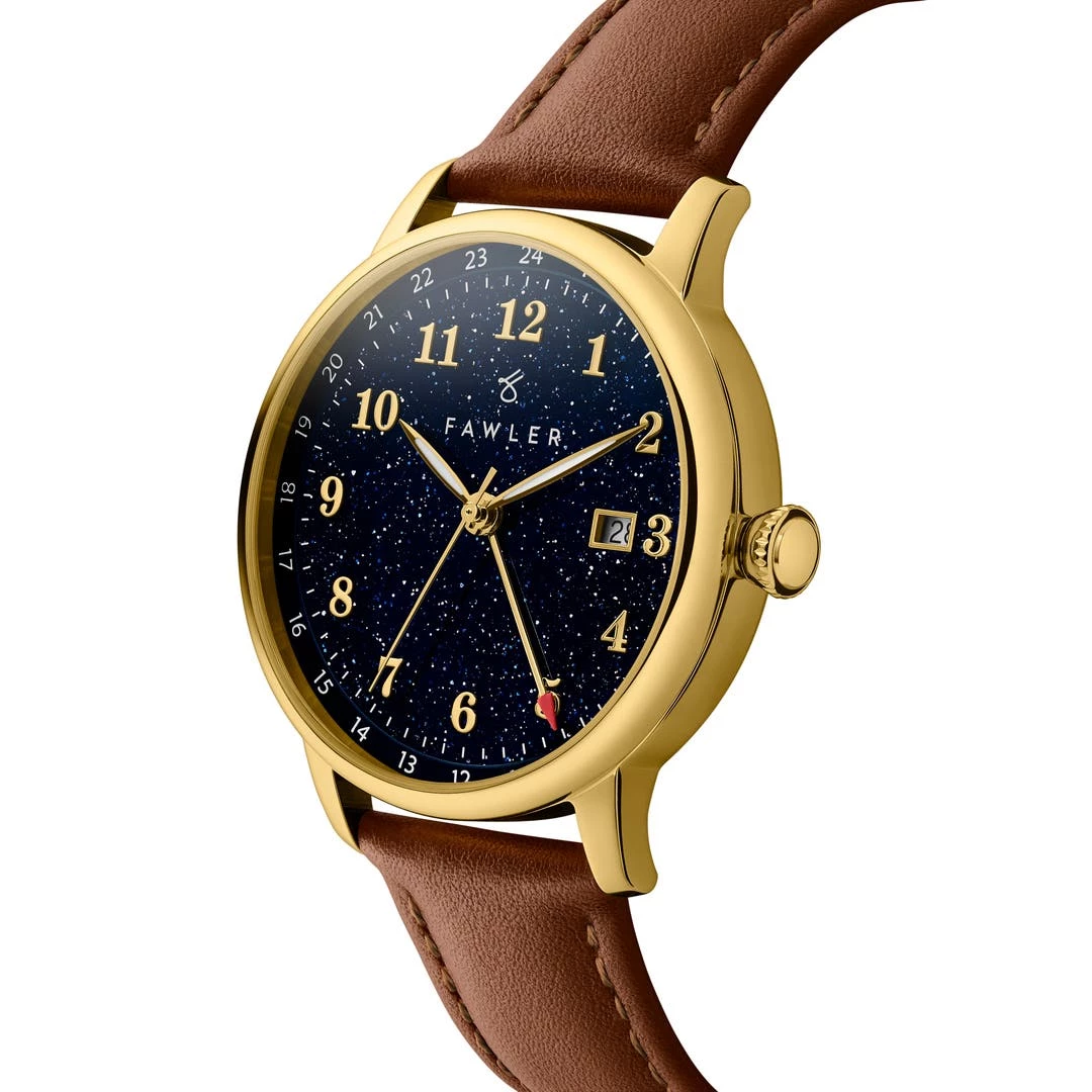 Perdez-vous dans les étoiles avec cette montre au cadran en aventurine bleue naturelle, constellée de poussière de muscovite qui scintille lorsqu’elle est exposée à lumière, rappelant l’éclat des ciels étoilés.