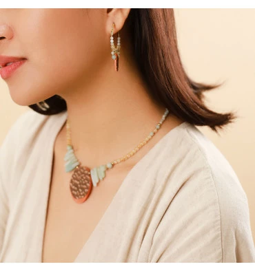 Composition de la ligne : Wood Veneer, Citrine, Amazonite, Métal sans nickel et traité contre les allergies.
