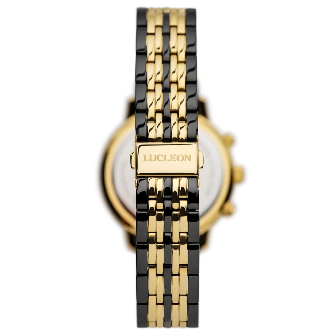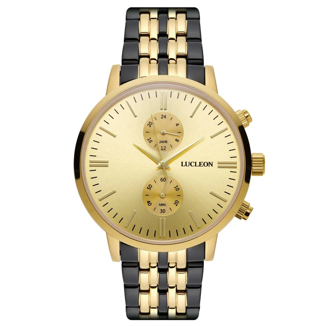 Deux sous-cadrans à chronomètre gardent une trace de chaque seconde, tandis que les aiguilles et les marqueurs dorés gardent votre style au point. Le bracelet en acier inoxydable est mis en valeur par des nuances noir et or qui s’harmonisent au boîtier robuste.