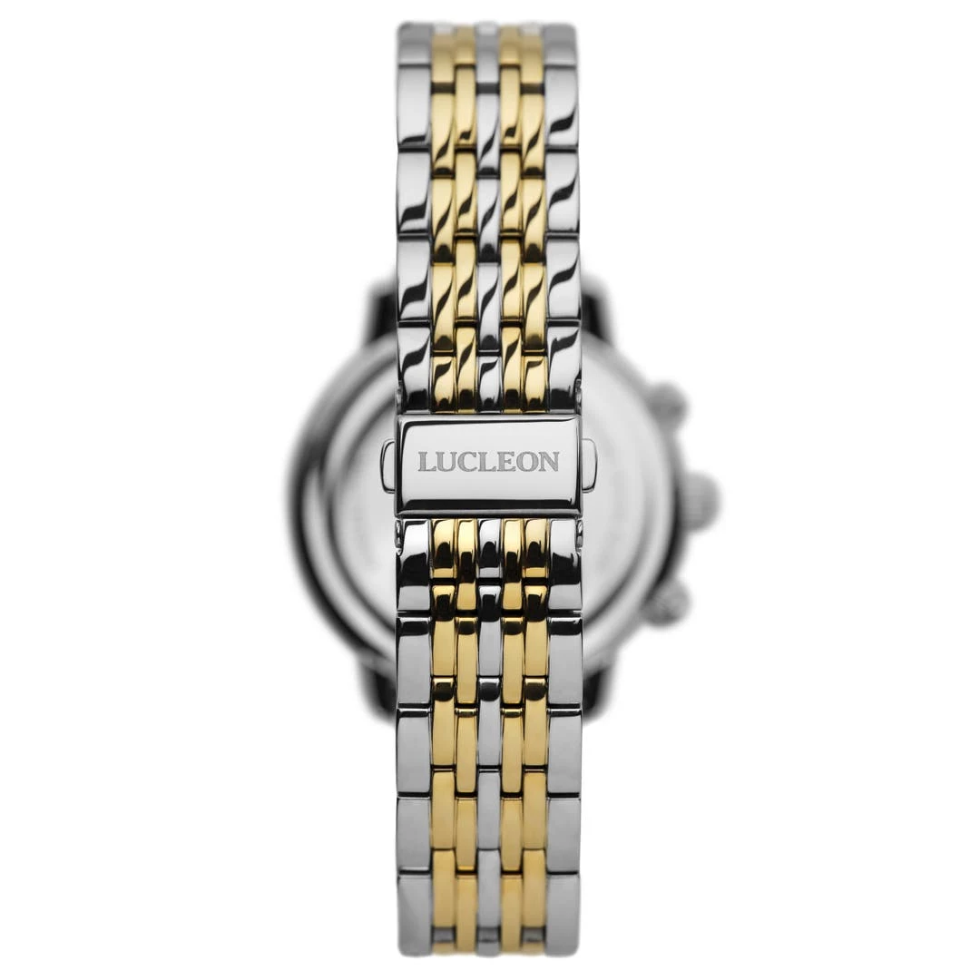 Son boîtier robuste est constitué d’acier inoxydable poli, doré et argenté, tout comme son bracelet qui le maintiendra parfaitement en place à votre poignet grâce à sa boucle déployante.