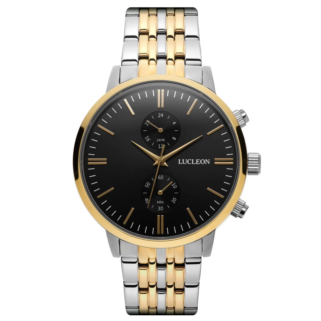 La lunette en métal poli met en valeur le cadran noir serti de marqueurs, aiguilles et de 2 sous-cadrans dorés.