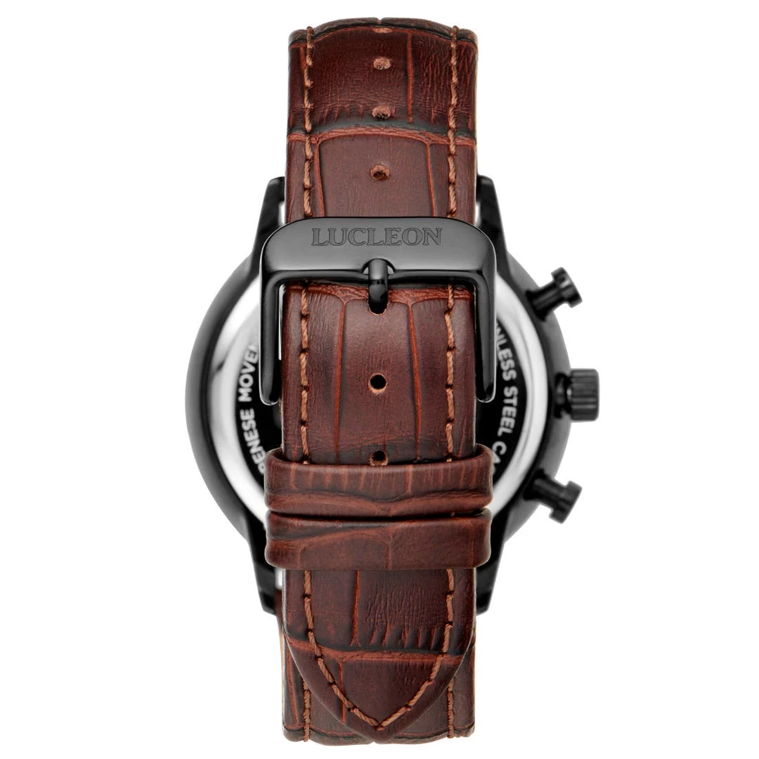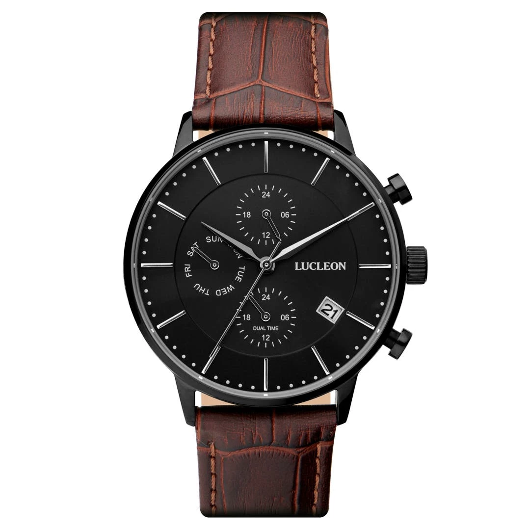 Une montre noire et marron du danois Lucleon construite autour d’un mouvement à quartz japonais et sertie d’un bracelet en cuir brun très doux au toucher et facilement interchangeable grâce à son système de broches à dégagement rapide.
