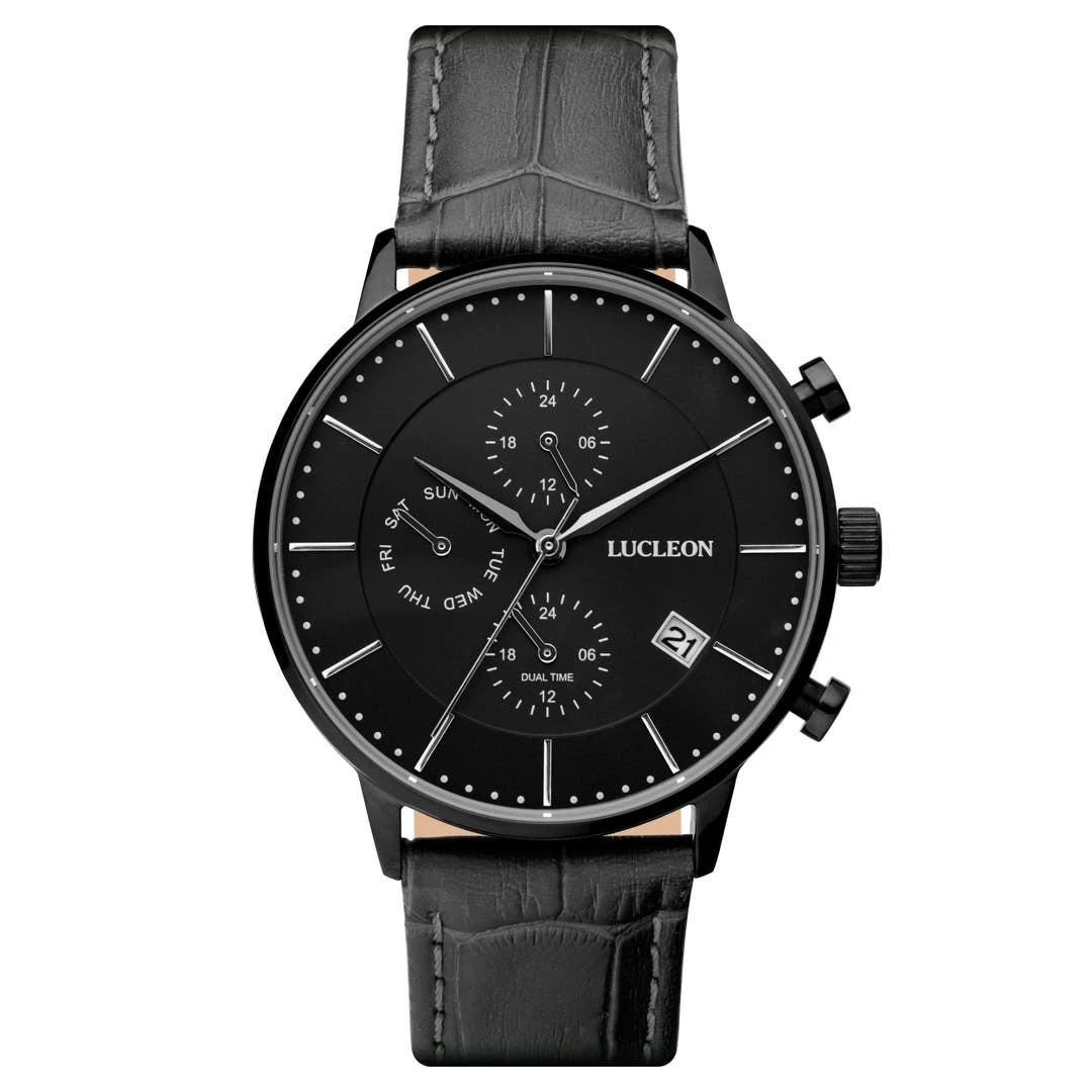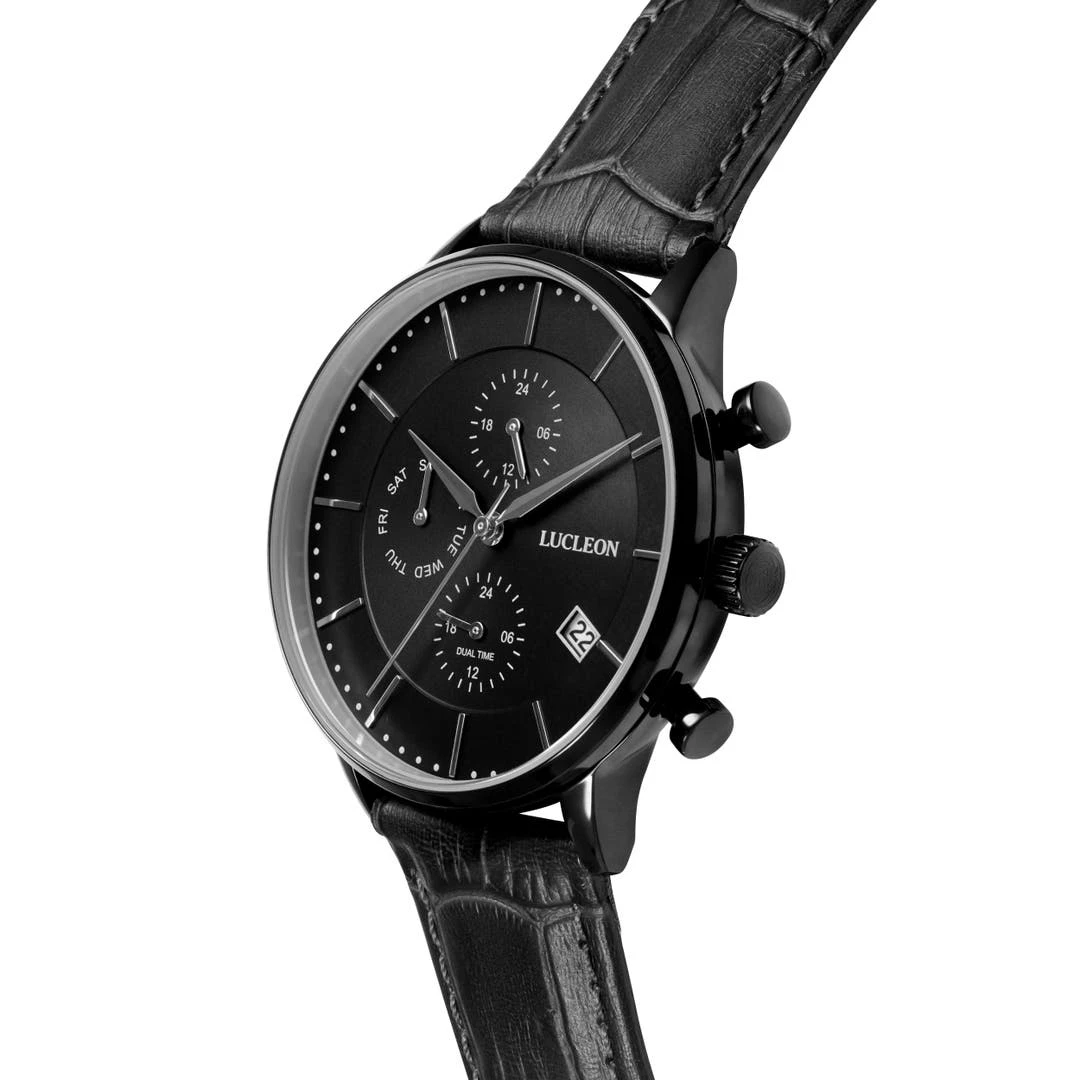 Son cadran noir est décoré de graduations, de chiffres, d’une fenêtre à fonction calendrier et de 2 cadrans très faciles à lire et à opérer à l’aide des boutons latéraux situés à deux et quatre heures. Un troisième sous-cadran vous renseignera le jour de la semaine… vous ne raterez donc plus jamais le début du week-end.