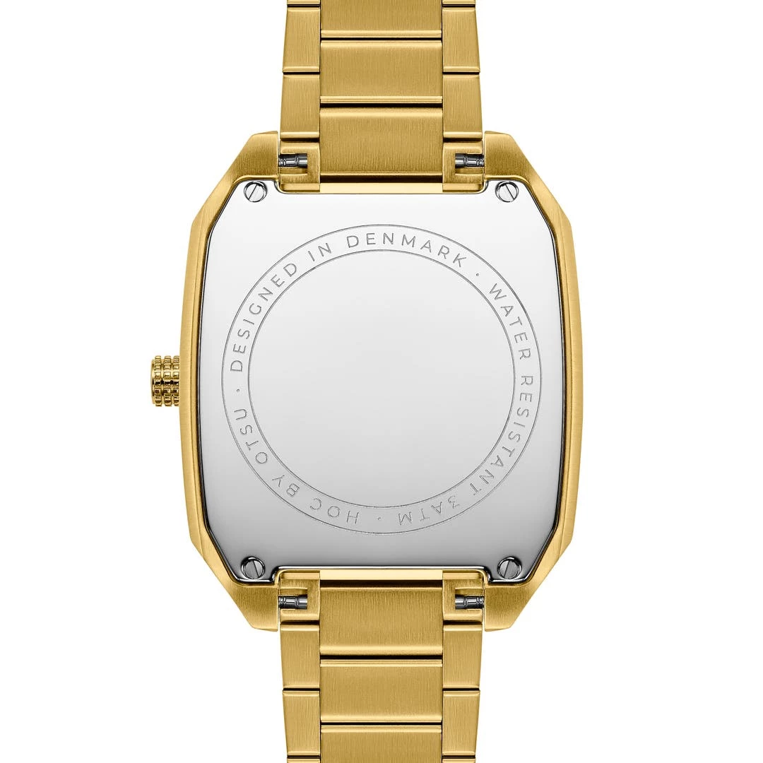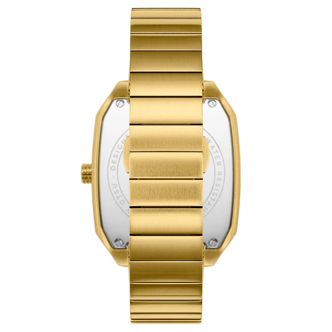 Sa couleur dorée est obtenue en appliquant du nitrure de titane à sa surface à l’aide d’un revêtement PVD, une méthode écologique qui minimise les déchets et élimine les déversements toxiques. Le nitrure de titane fusionne avec le métal au niveau moléculaire et possède une microdureté de 2400 HV, rendant cette montre pour homme résistante aux rayures et lui donnant une magnifique finition brillante qui ne se décolore pas et ne s’écaille pas.