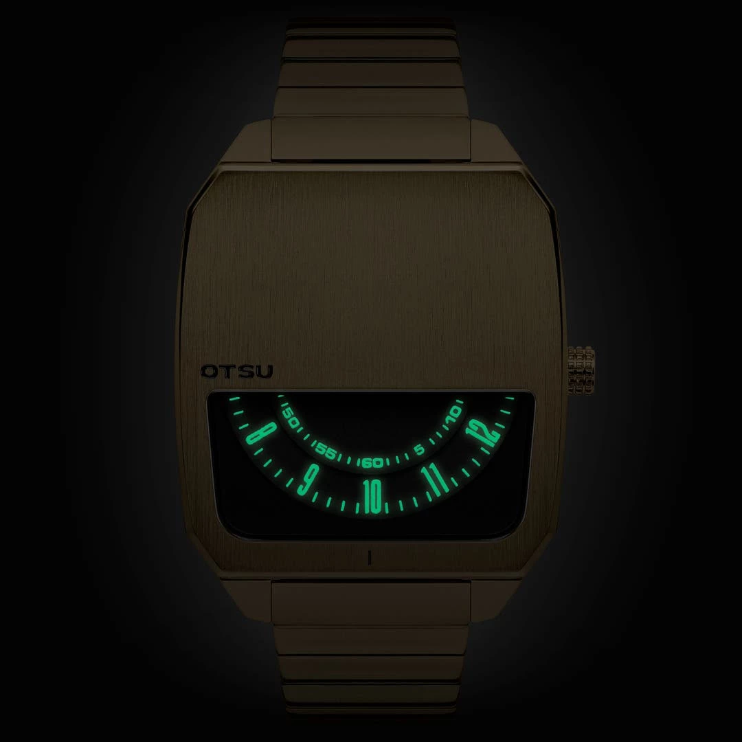 Au bas du cadran de la montre, un trait très discret pointe vers le centre de la montre. Pour lire l’heure, prolongez simplement ce trait jusqu’aux cadrans des heures et des minutes. Une lumière phosphorescente rendra cette montre lisible même dans l’obscurité totale. Le logo OTSU en émail noir décore fièrement sa face avant.