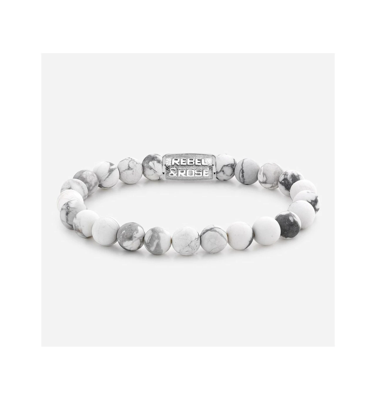 Bracelet extensible mixte signé REBEL&ROSE composé de perles semi précieuses de 8mm et orné du logo de la marque pour son authentification.