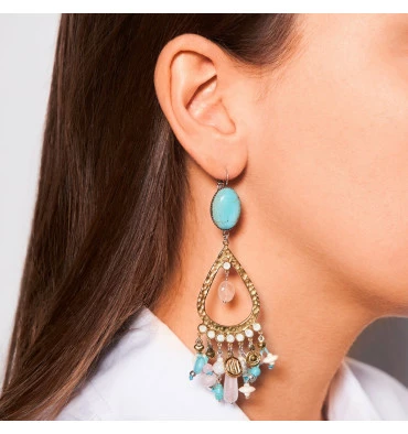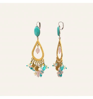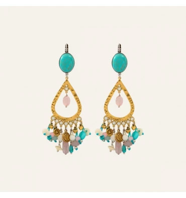 Boucles d’oreilles Goutte signées REMINISCENCE Paris. Avec leur forme de goutte, ces boucles d’oreilles associent avec raffinement doré et argenté. Motifs et pierres naturelles aux couleurs douces et lumineuses dansent.