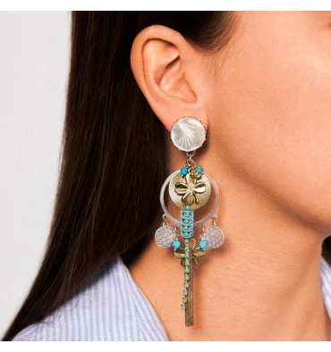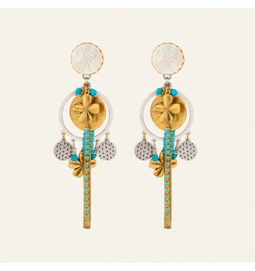 Boucles d’oreilles clips issues de la marque RÉMINISCENCE Paris. Nacre, perles de verre et cristaux s’associent au métal doré et argenté pour créer ces boucles d’oreilles à Clip Ibiza. Les trèfles dorés se suspendent et se balancent : de véritables grigris !