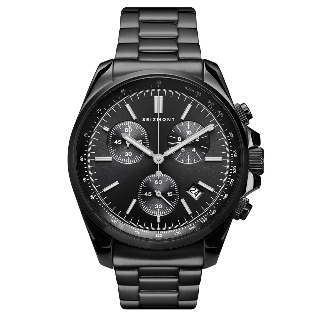 Le boîtier de 44 mm est construit en acier inoxydable 316L très solide et arbore un cadran noir assorti avec 3 sous-cadrans à fonction chronomètre. Un tachymètre, une fenêtre à affichage de la date et des aiguilles et marqueurs luminescents viennent compléter cet ensemble. Une montre parfaite pour partir à l’aventure.