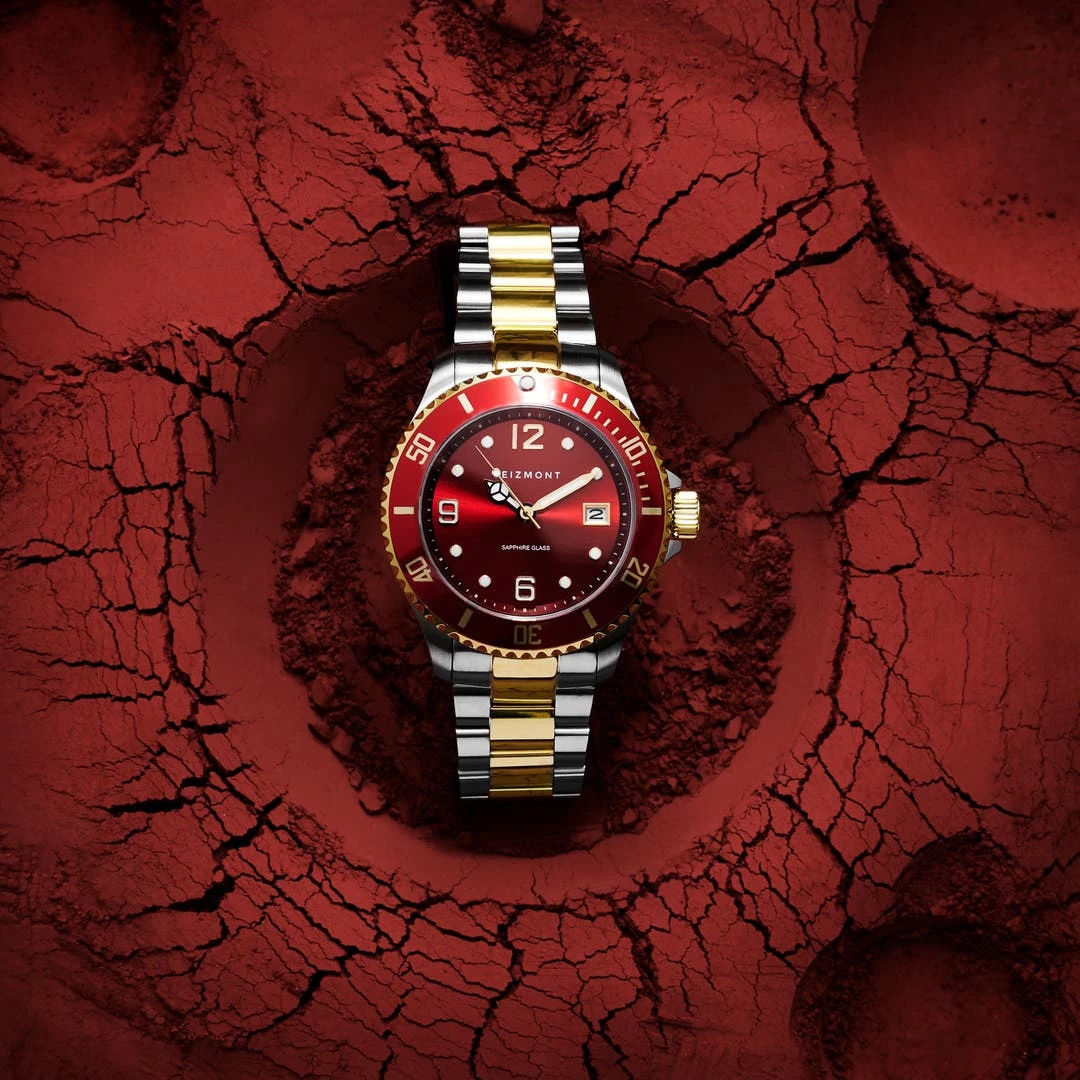 Son impressionnant cadran rouge est serti d’aiguilles et de marqueurs luminescents ainsi que d’une fenêtre à fonction calendrier à 3 heures. Une lunette de plongée graduée vient compléter cet ensemble.