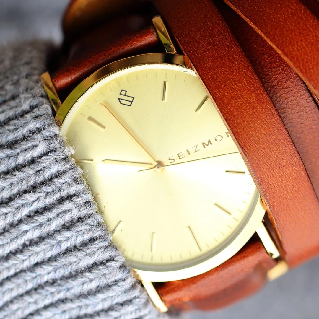 Son cadran doré sort du lot et se fait remarquer au premier coup d’oeil. Son bracelet en cuir marron l’accompagne de manière parfaitement élégante.