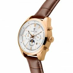 Elle est équipée d’un bracelet en véritable cuir marron doux et confortable. La pointe de sa trotteuse est de couleur bleue, aussi subtile qu’élégante.