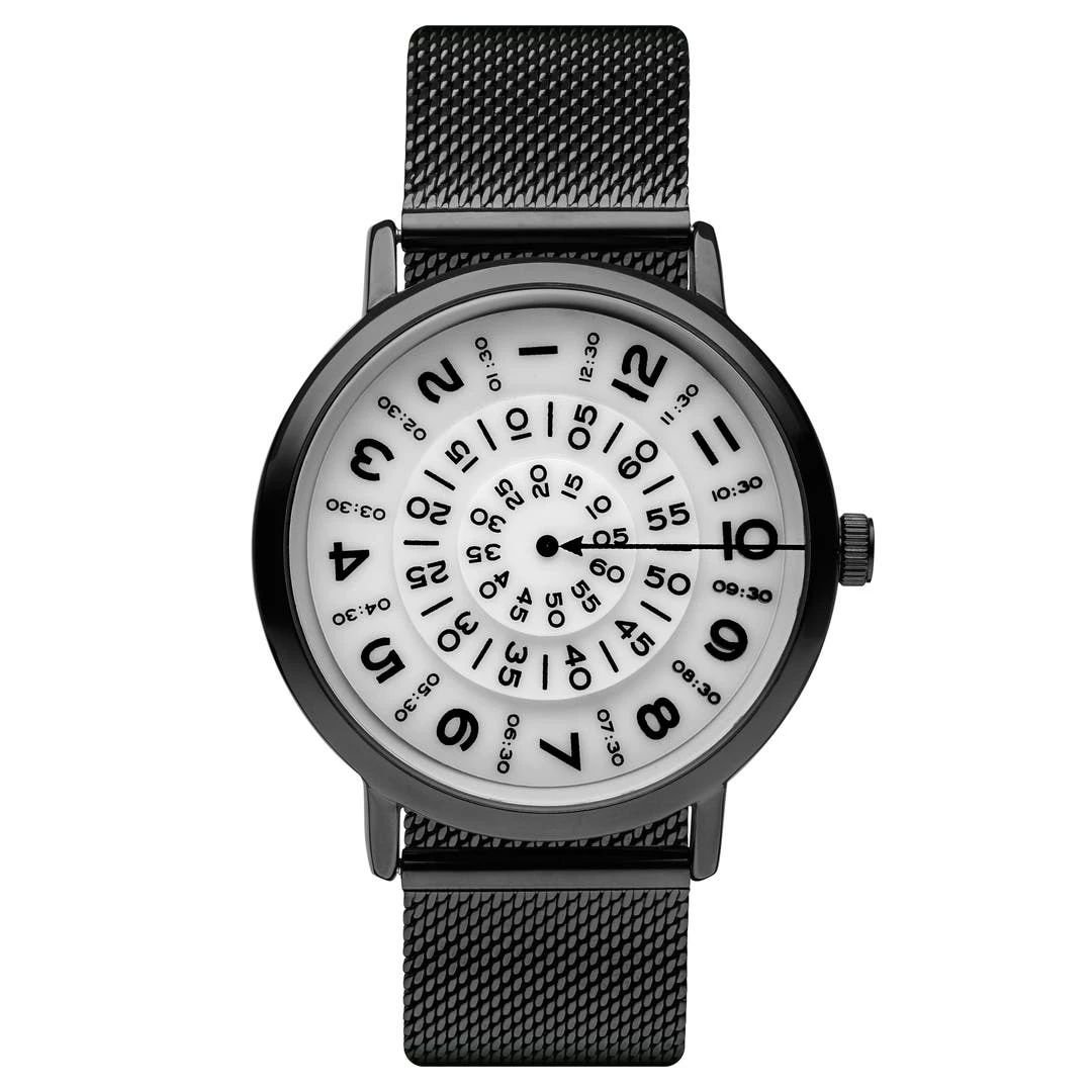Pourquoi ne pas le réveiller avec cette montre noir et blanc de Seizmont. L’heure (chaque cadran) tourne autour d’une flèche noire fixe… pour vous rappeler qu’elle est constamment en mouvement et vous invite à profiter de chaque instant qui passe.