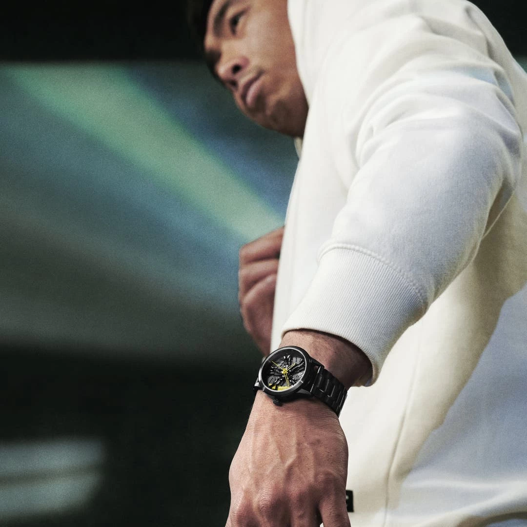 Une montre pour homme qui tire son inspiration du monde de la course automobile. Le design de son cadran évoque un frein à disque et des jantes noires maintenues en place par des boulons gris métallisé. Il est également décoré d’aiguilles et d’un frein de couleur jaune.