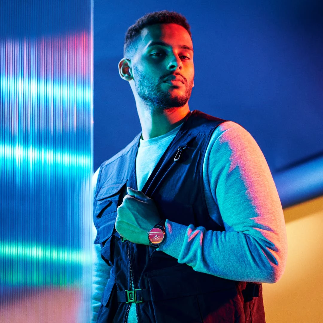 Le verre bombé de cette montre pour homme présente de légers reflets jaunes et rouges pour lui donner une touche de couleur aussi subtile qu’élégante.