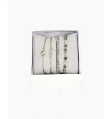 Coffret Strass Box Etoile 22 signé LES INTERCHANGEABLES. La Strass Box Etoile 22 est le coffret idéal à offrir. Une box de 4 bracelets pour femme parfaitement assortis qui se décline dans les couleurs de vos envies. Mêlant élégamment le ruban de qualité couture, les cristaux de luxe et les perles semi précieuses.