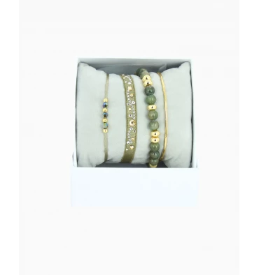 Coffret Strass Box New Arabesque signé LES INTERCHANGEABLES. Composée de 4 bracelets ornés de luxueux cristaux de haute qualité et de perles semi- précieuses, cette Strass Box fera la joie de toutes les femmes qui aiment le style et l’élégance. Fabriqués à la main en France, ils se portent seuls ou à plusieurs mais toujours avec style ! Disponibles dans plusieurs coloris. Ajustables et résistants à l’eau.