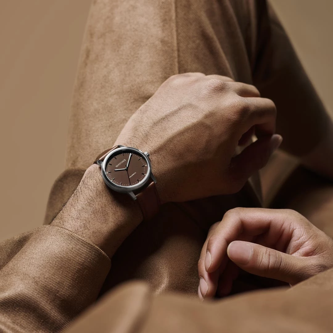 Attachée fermement à votre poignet avec un bracelet interchangeable en cuir marron véritable. Changez-le en un tour de main avec vos doigts pour seuls outils.